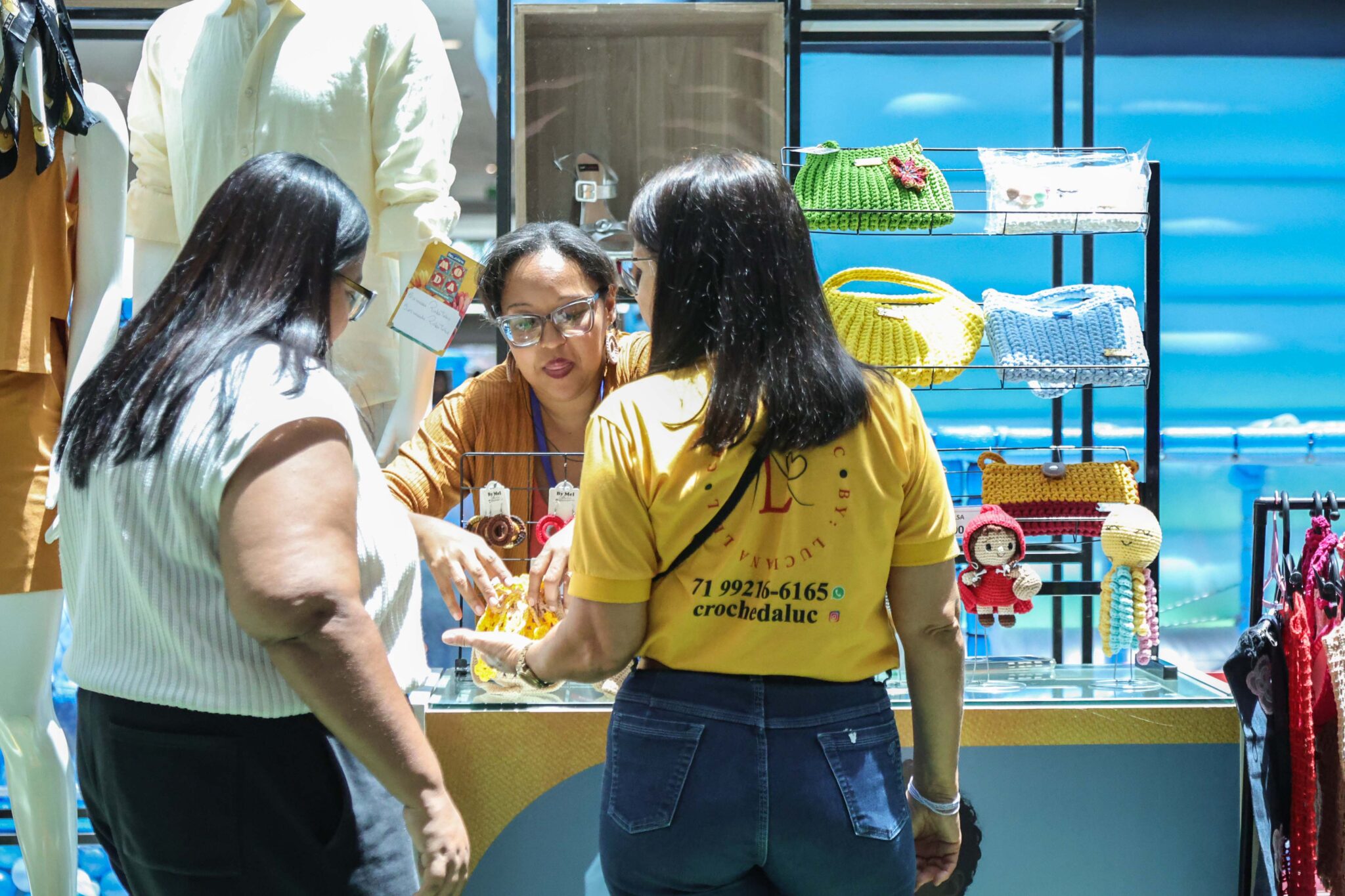 “O crochê é ancestral, uma prática passada de mães para filhas. E, hoje, esse ofício é empreendido inclusive de forma internacional, com vários artistas utilizando e divulgando. Temos a rotatividade com quatro empreendedoras por vez, com peças voltadas para o vestuário, acessórios, bolsas, brincos e bandanas, com valores que variam de R$ 15 a R$ 180”.
