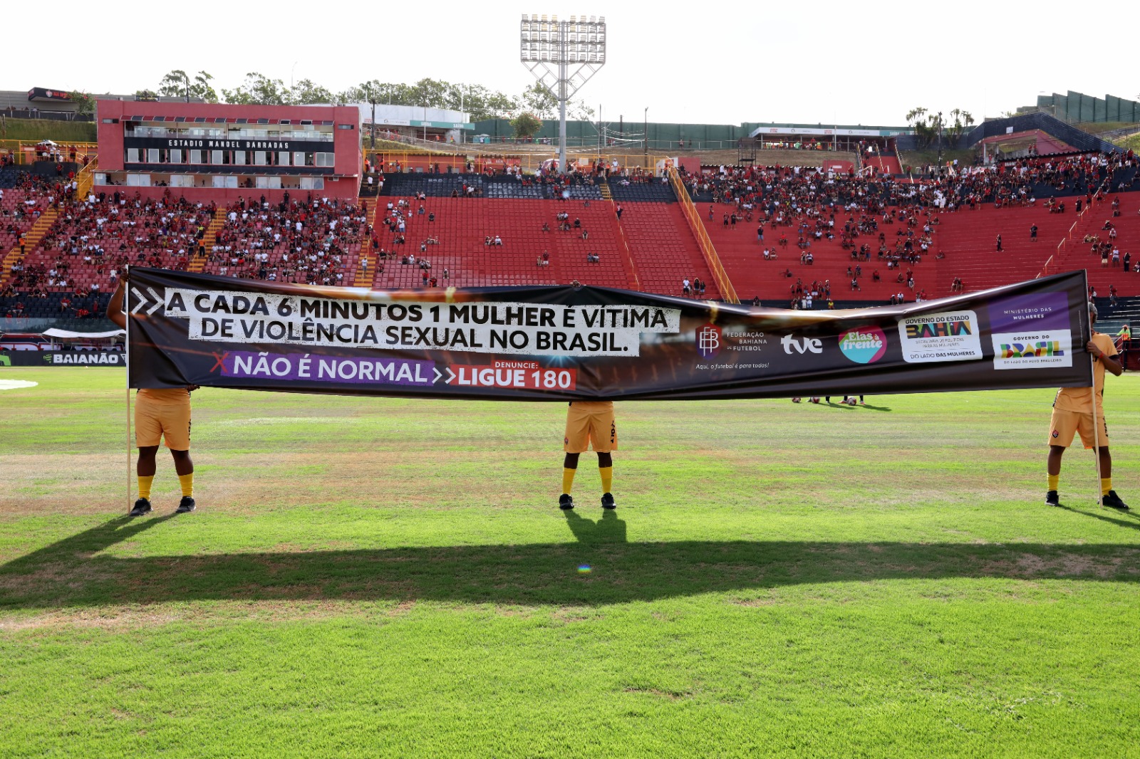 O futebol baiano entrou em campo neste sábado (10) com uma mensagem que vai além do esporte. Durante a abertura do Campeonato Baiano de Futebol 2026, o Governo do Estado lançou uma campanha pelo fim da violência contra a mulher, utilizando a visibilidade do Baianão para ampliar a conscientização e incentivar a denúncia de casos de violência de gênero. A iniciativa é da Secretaria de Políticas para as Mulheres (SPM), em parceria com o Instituto de Radiodifusão Educativa da Bahia (Irdeb), e marcou a partida entre Vitória e Atlético de Alagoinhas, no Barradão, em Salvador.