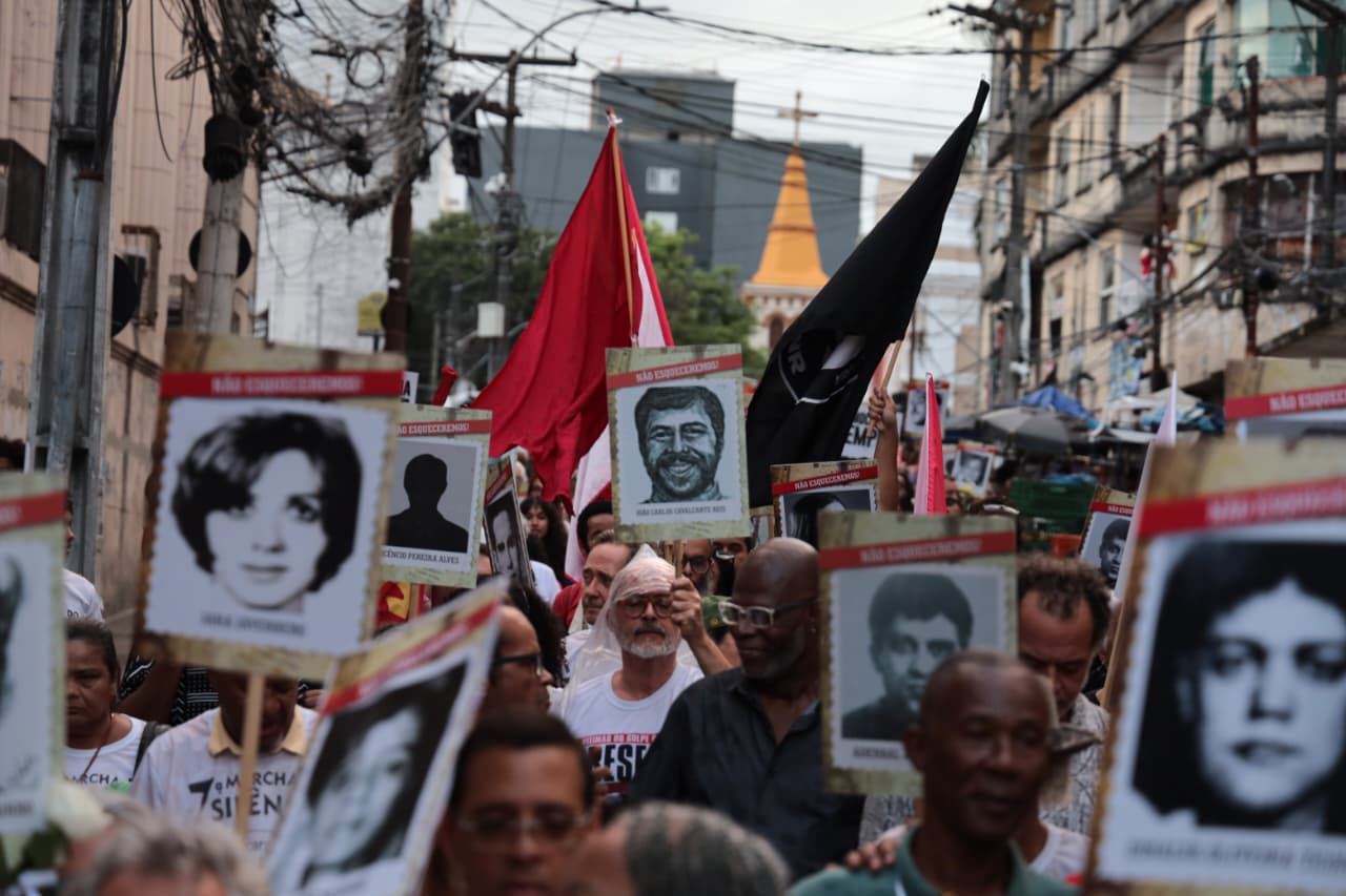 A luta pela democracia e preservação da memória coletiva mobilizou estudantes, ativistas dos direitos humanos, familiares das vítimas da ditadura militar e diversas autoridades para 7ª Marcha do Silêncio, realizada nesta quarta-feira (1°), em Salvador. O ato, que teve como tema ‘Crime Continuado: Lembrança Permanente’, relembrou os 62 anos do Golpe Militar, um dos mais tristes períodos da história do Brasil. A Secretaria de Justiça e Direitos Humanos (SJDH) participou do evento, reafirmando o compromisso de fortalecer as ações que promovem a preservação da memória e da verdade, além da construção de um país justo e democrático. A Marcha do Silêncio iniciou na Praça da Piedade com apresentações de capoeira e de poesia, destacando a arte como instrumento de formação social e resistência.