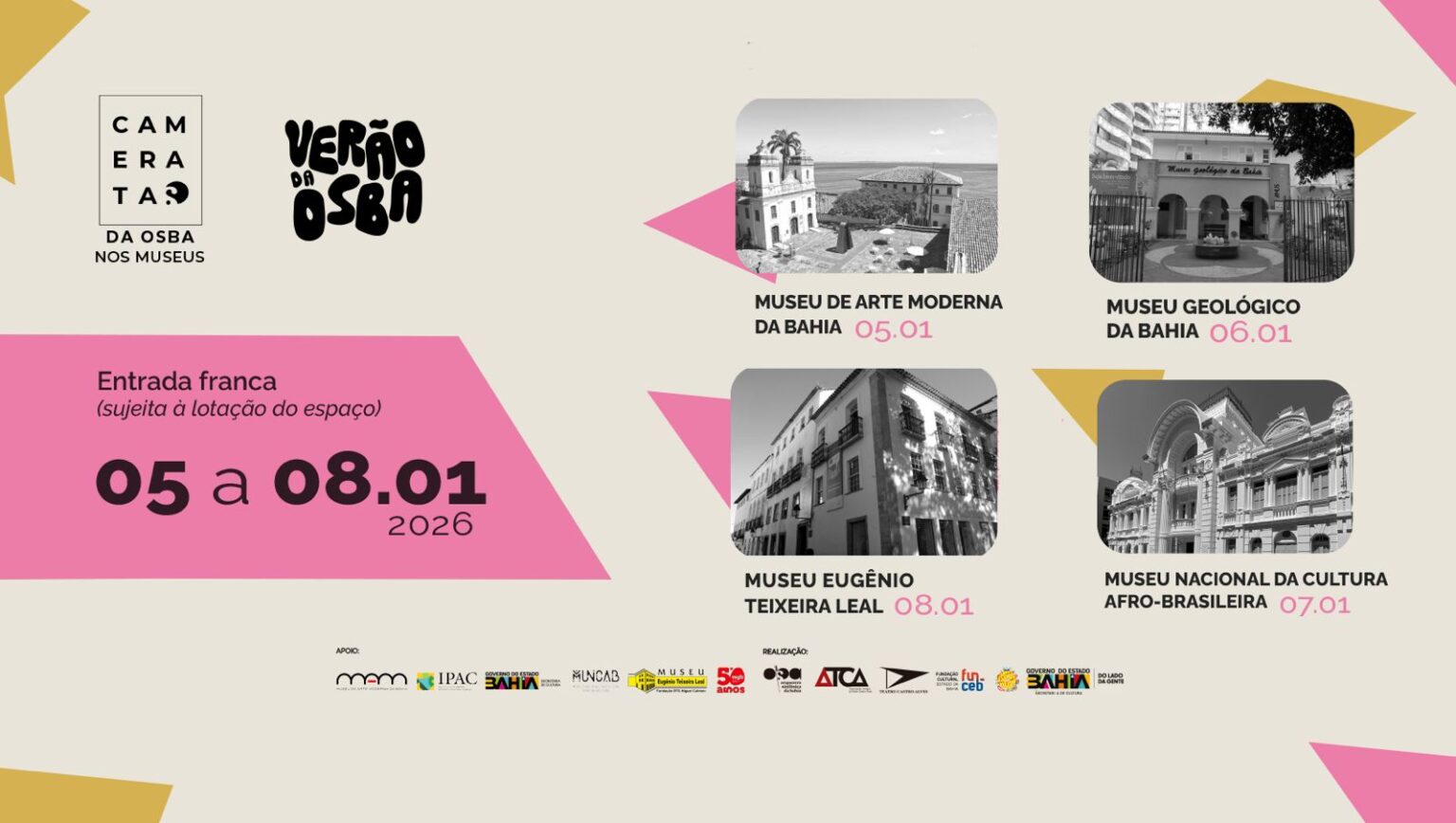 O Verão da OSBA 2026 conta ainda com a realização, de segunda a quinta-feira (5 a 8), da segunda edição do projeto “Cameratas nos Museus”, com apresentações gratuitas em quatro equipamentos culturais de Salvador: Museu de Arte Moderna da Bahia, Museu Geológico da Bahia, Museu Nacional da Cultura Afro-Brasileira (MUNCAB) e Museu Eugênio Teixeira Leal.